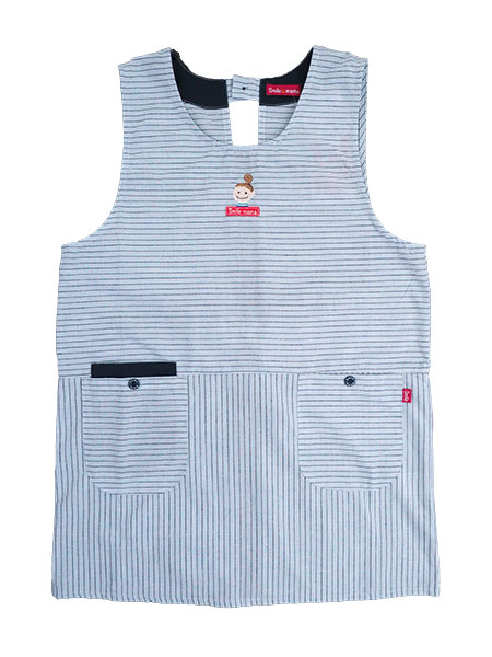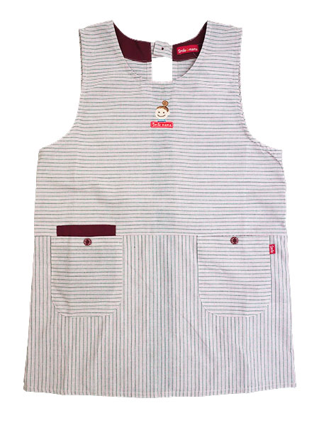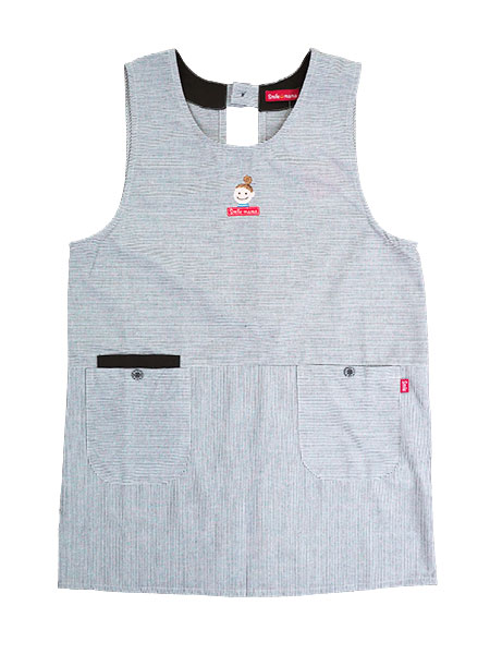 スマイルママのレディースラン型エプロン、スマホポケット。胸元にスマイルママのかわいいワンポイントがあります。右ポケットはダブルポケット仕様で、内ポケットがスマホを入れるのに丁度いいサイズになっています(横幅約10cm)。前後ともに生地の向きを変えたウエスト切替デザイン。両サイドにポケット付き、ボタンは飾りです。後ろは首元ワンボタン留め、ウエストひも調節となります。年間を通してお使いいただける素材のエプロンです。