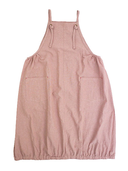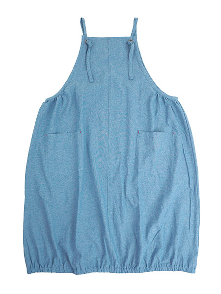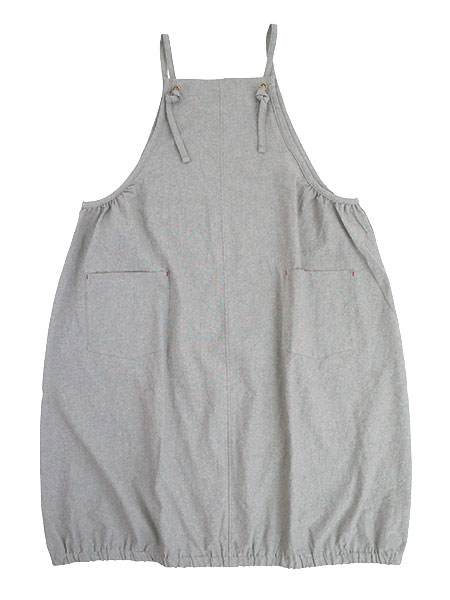 naturicのレディースワンピースエプロン。生地に洗いをかけた綿100%素材でナチュラルな風合いのエプロン。裾がゴム入りギャザーのゆったりバルーンシルエットなので体型カバーにもなります。前後ともにセンターシームがあり、両脇下にギャザー入り。肩ひもは結んで長さの調節ができます。前左右にポケット付き。