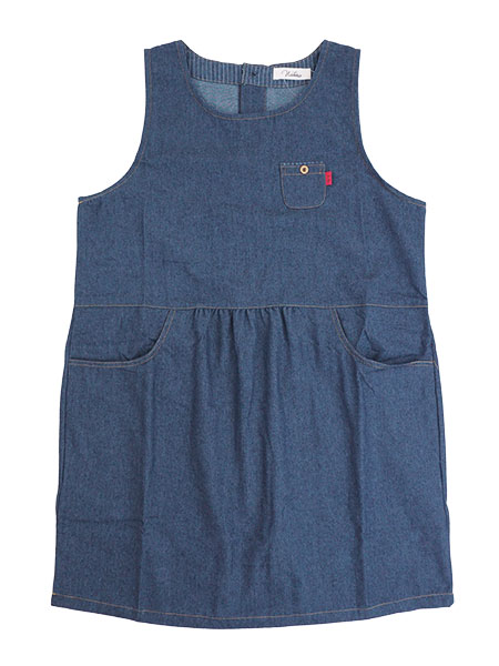 naturicのレディースラン型エプロン。やわらかなデニム生地を使用したおしゃれなエプロン。後ろが3つボタン開きのかぶりタイプです。ウエストは前後ともに切替になっていて切替下にギャザー入り。左胸部分に飾りボタン付きのミニポケット、前左右にポケット付き。