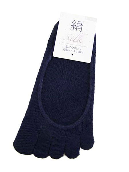 絹(silk)のレディース5本指フットカバー。肌にやさしい表糸シルク100%使用。吸湿性、放湿性に優れ、肌をいつも快適に保つことができます。エレガントな光沢としっとりとした風合いのフットカバーです。サイズ:22〜24cm、日本製。