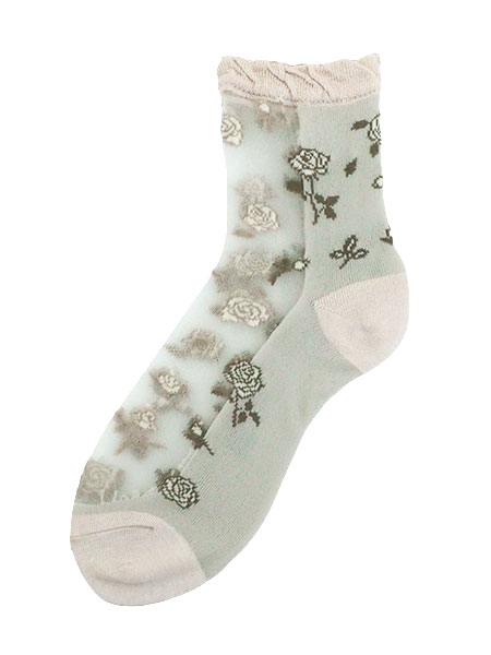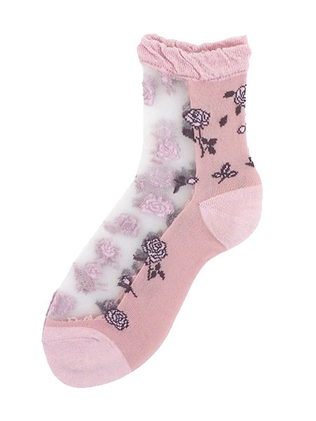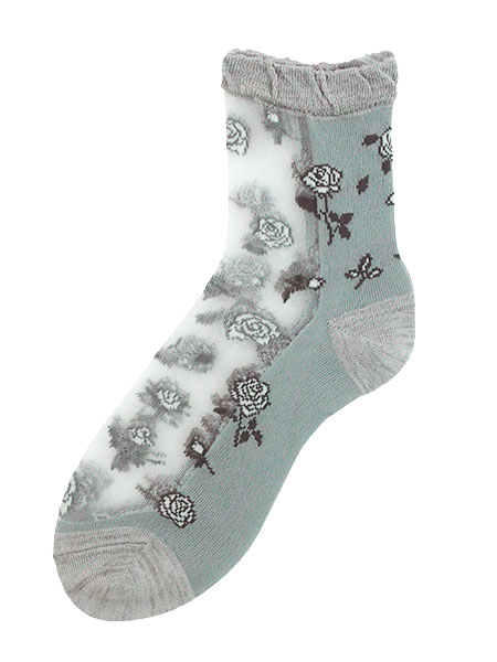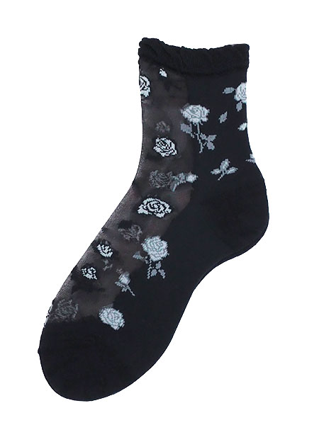 シルク混のレディースシースルーソックス。シースルー部分に枝付きローズがデザインされた、足底付きの日本製靴下。甲と足首の前部分がシースルーで、サンダルスタイルなどにもおすすめです。サイズ:22〜24cm、丈はかかとから約13cm※パッケージが異なる場合がありますが商品は同一のものとなります。