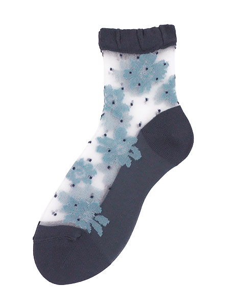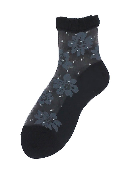 シルク混のレディースシースルーソックス。シースルー部分に花とドット柄がデザインされた、足底付きの日本製靴下。甲と足首の部分がシースルーで、パンプス・サンダルスタイルなどにもおすすめです。サイズ:22〜24cm、丈はかかとから約13cm※パッケージが異なる場合がありますが商品は同一のものとなります。