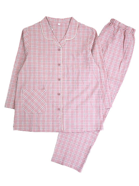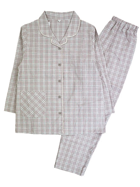 NERUGY、レディース綿100%先染めシーチング素材チェック柄のパジャマ。平織りの素材は柔らかで着心地がよく、清涼感もあり、綿100%素材なので敏感肌の方にもおすすめです。ナチュラルな印象のチェック柄。ウエストゴムはボタン位置を変えることで長さが調整できます。上衣:テーラー襟の前あき、右前にポケット付き。パンツ:裾ストレート、ポケットなし、ウエストゴム調整機能付き、ウエストゴム取り替え口付き。