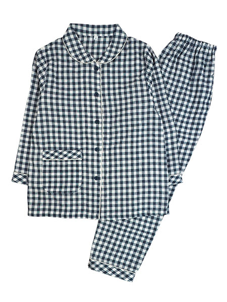 NERUGY、レディースの綿100%ダブルガーゼパジャマ。上質な二重ガーゼ素材で素肌に優しく適度に保温性もあり、洗濯するたびにふんわり、一年中快適にお使いいただけます。かわいいギンガムチェック柄。ウエストゴムはボタン位置を変えることで長さが調整できます。上衣:襟付きの前あき、右前にポケット付き。パンツ:ポケットなし、ウエストゴム調整機能付き、ウエストゴム取り替え口付き。