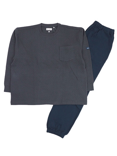 GUNZE(グンゼ)COMME CI COMME(コムシコムサ)のメンズパジャマ。本体には、表裏綿100%(肌に当たる部分は綿100%)のふんわり膨らみ感があるダイヤキルト素材を使用。寒い季節に適した保温性のある暖かい素材です。上衣:トレーナータイプ、襟ぐりリブ、袖口切替、左胸にポケット付き、左袖にロゴのワンポイント。パンツ:前とじ、裾ゴム入り、両サイドにポケット付き、ウエストゴム取り替え口付き。