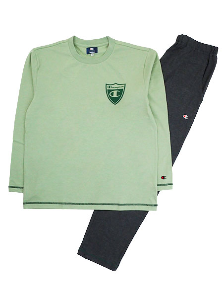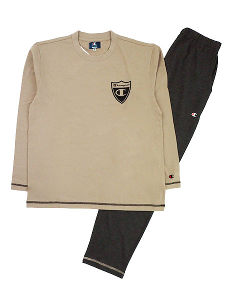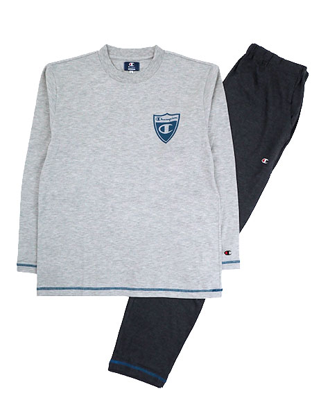 GUNZE(グンゼ)Champion(チャンピオン)メンズ長袖パジャマ。風合いが良く伸縮性に優れた薄手ニット素材の綿混天竺素材を使用した春夏向きルームウエアです。上衣:かぶりタイプ、左胸にロゴプリント、袖先にワンポイント刺繍、袖先と裾周りに飾りステッチあり、ポケットなし。パンツ:ストレート、両サイドポケット付き、裾周りに飾りステッチあり、左ポケット下にワンポイント刺繍、ウエストゴム取り替え口付き。