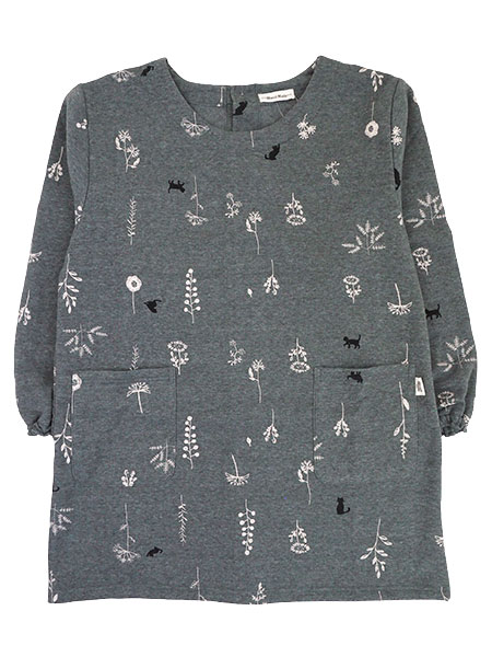 >Hand Made 裏起毛ニット割烹着 背ボタン 花と猫プリント柄