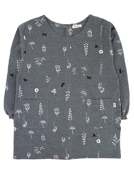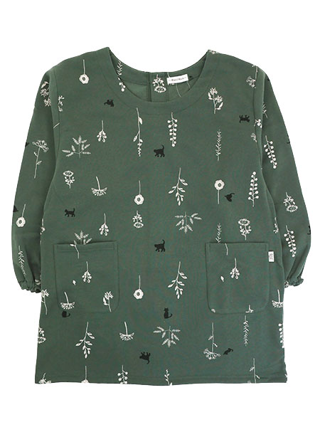 Hand Made 裏起毛ニット割烹着 ゆったりLL-3Lサイズ 背ボタン 花と猫プリント柄