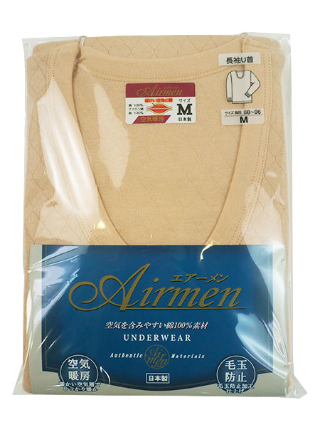 エアメンメンズの長袖U首シャツ 表・裏 綿100%、中綿ナイロン100%の三重構造で、暖かく、吸汗性抜群の最高級のキルト肌着です。※パッケージが異なる場合がありますが商品は同一のものとなります。