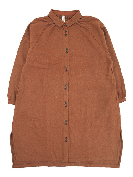 Cloudnineレディースの毛混フランネルワンピース。暖かみのあるフランネルの風合いとしっかりした厚みが心地よい生地感。ラグラン袖やネックのギャザーがふんわりとしたシルエットを生み出しカジュアルなシルエットに。前開き、ミニ襟付き、袖口カフスボタン開き仕様でギャザー入り。裾両サイドカット、深さ:前19cm、後24cm脇にスラッシュポケット付き。ボタン2段目は飾りボタン仕様。前を開けて羽織感覚でも活躍するアイテムです。