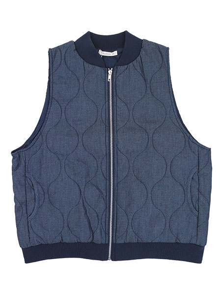 Cloudnineレディースのキルティングベスト。表がひょうたん柄中綿入りキルトで裏地がタフタ素材、襟ぐりと裾がリブになっています。前ファスナー開き、両サイドポケット付き。表地はカラーによって異なります(ネービー:デニム、モカ:コットンツイル、ブラック:コットンミニギンガム)軽くて暖かく、ロングシーズン活躍する万能アイテムです。シャツやワンピースに重ねて、こなれたレイヤードスタイルをお楽しみください。
