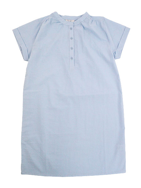 naturic、レディースの先染サッカーワンピース、無地。サラッとさわやかで暑い季節に適した綿100%サッカー生地のルームワンピース。前4個ボタン開きで半開のかぶりタイプ、肩にギャザー入り、袖は折り返し仕様。後ろはヨーク切替でセンターにギャザー入り。ポケットなし。