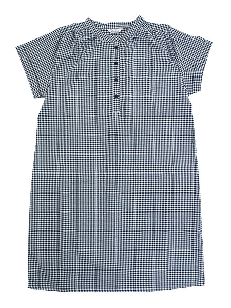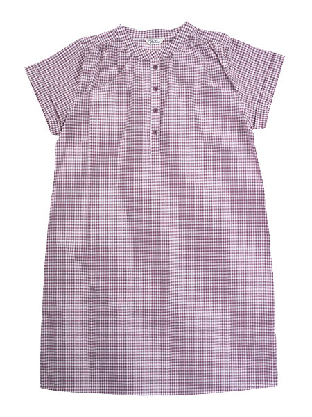 naturic、レディースの先染サッカーワンピース、ギンガムチェック柄。サラッとさわやかで暑い季節に適した綿100%サッカー生地のルームワンピース。前4個ボタン開きで半開のかぶりタイプ、肩にギャザー入り、袖は折り返し仕様。後ろはヨーク切替でセンターにギャザー入り。ポケットなし。
