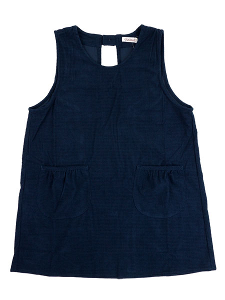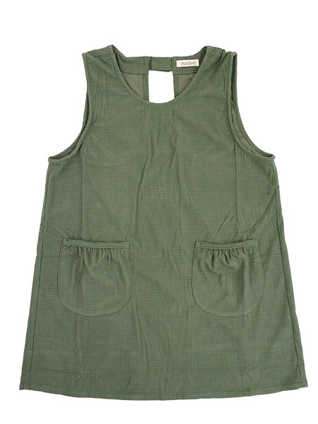naturicのレディースラン型エプロン、かぶりタイプ。単色のコーデュロイ生地の表面効果が、秋冬向きのエプロンです。後ろはネック部分ワンボタンでウエストまで半開、ウエストセンターにゴム入りです。前面左右にポケット付き。