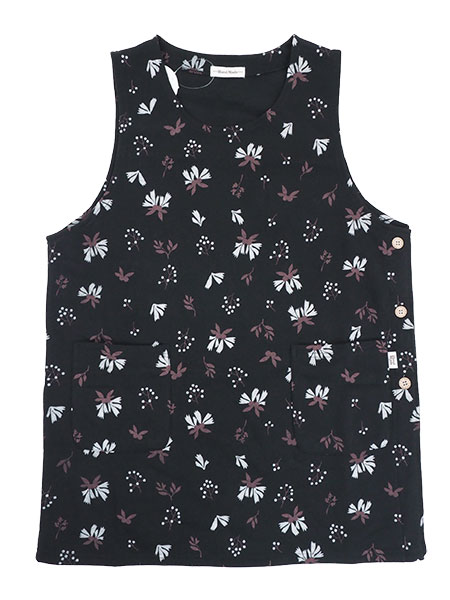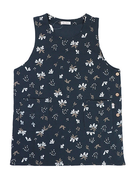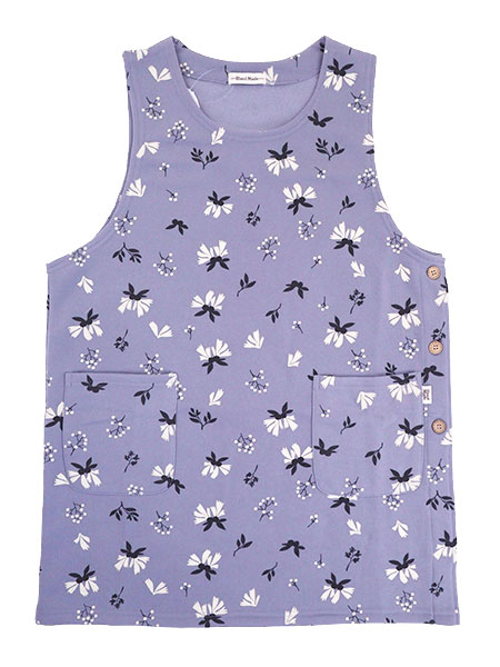 Hand Madeのレディースラン型エプロン、木の実プリント柄。裏起毛ニット、心地よい裏起毛でぽかぽかあったかい。タバード、左サイドボタン開きのかぶりタイプ。前左右にポケット付き。