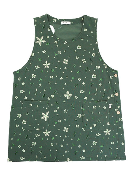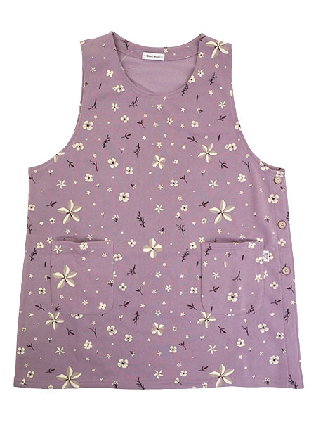 Hand Madeのレディースラン型エプロン、ゆったり大きめLL〜3Lサイズ、花柄プリント。裏起毛ニット、心地よい裏起毛でぽかぽかあったかい。タバード、左サイドボタン開きのかぶりタイプ。前左右にポケット付き。