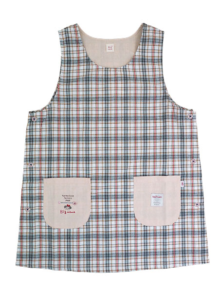 Big mamaのレディースラン型エプロン。両脇がボタン開きのかぶって着るタバードエプロンです。後ろは隠れるので体型カバーにもなります。別布無地のポケットが前面左右に付いています。右ポケット部分にビッグママのかわいい刺しゅう入り。年間を通してお使いいただける素材のエプロンです。