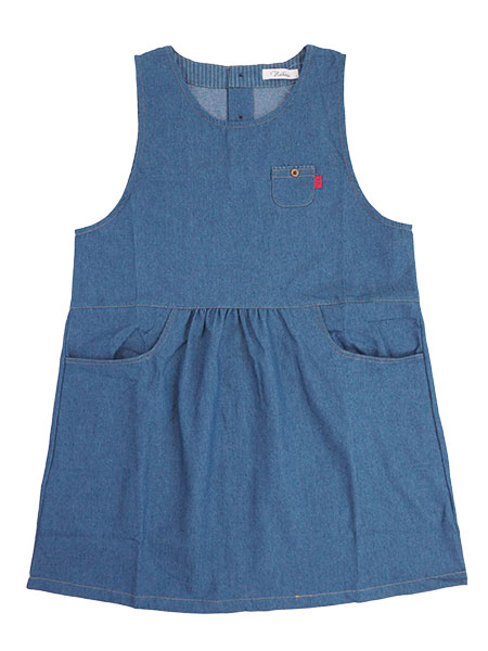 naturicのレディースラン型エプロン。やわらかなデニム生地を使用したおしゃれなエプロン。後ろが3つボタン開きのかぶりタイプです。ウエストは前後ともに切替になっていて切替下にギャザー入り。左胸部分に飾りボタン付きのミニポケット、前左右にポケット付き。