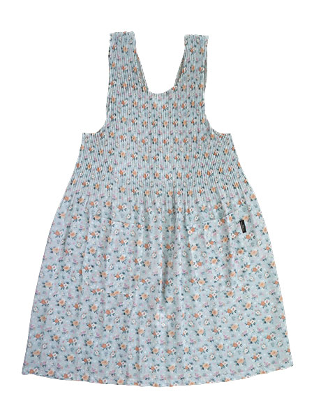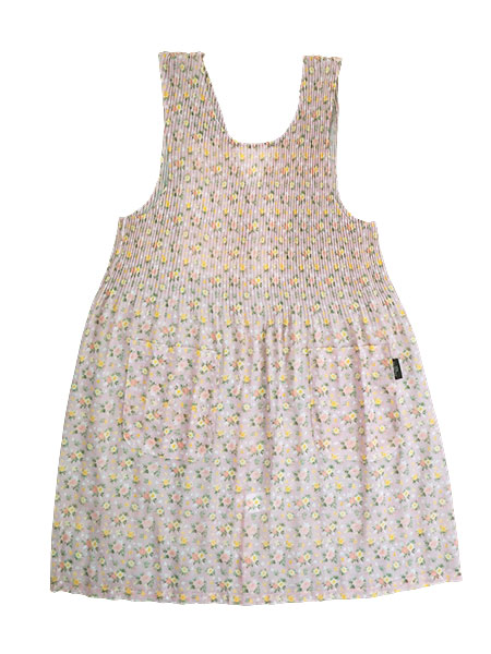 SOFIA VALENTINOのふんわりプリーツ仕様のエプロン。おしゃれな花柄プリントで少し透け感があり上半身がプリーツで伸縮します。軽くて着心地が良く、美しいシルエットです。柔らかいシフォン生地はサラッとした手ざわりでしわになりにくいポリエステル素材です。後ろは背中部分がV型、全開で3か所ボタン留めタイプ。両サイドにポケット付き。