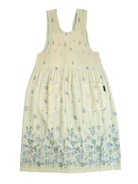 SOFIA VALENTINO、レディースのエステル格子エプロン。胸部分にプリーツ加工が施されたロング丈のエプロンです。すっぽりかぶって簡単に着用できます。やや透け感のあるエステル格子生地に花柄がプリントされています。後ろは背中部分がV型、全開で4か所ボタン留めタイプ。上半身がプリーツ仕様になっていて伸縮性があります。サラッとした手ざわりでしわになりにくいポリエステル素材です。前左右にポケット付き。