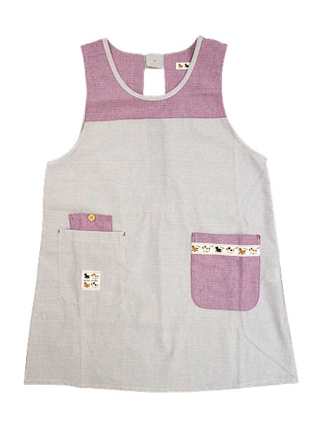 BABY PONYのレディース、ラン型エプロン、かぶりタイプ、後ろゴム、ドビーダンガリーの無地。前ヨーク部分が、アクセントカラーの切り替え。後ろはネック部分がワンボタン留めでウエストまで半開、ウエストセンター部分にゴム入りのお尻が隠れるタイプのエプロンです。前に2個ポケット、BABY PONYのイラストアップリケ付き。右側のみダブルポケットで、飾りミニボタン付き。