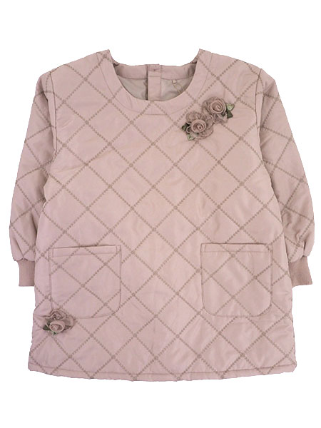 bonteレディースの中わたキルト、花モチーフかっぽう着。中わた入りでふっくら暖かいキルトの割烹着。保温性に優れているので冬の家事もあったか快適です。左胸と右ポケット下部分に花のモチーフ付きで袖口はリブ仕様です。ポケットは前面左右と後ろ右に1個付き。後ろは全開のボタン留めタイプです。