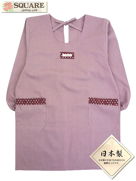 SQUAREのレディースカッポー。胸元とポケット口の水玉柄のアクセントがおしゃれな無地のエプロン。後ろは首部分、腰部分ともにリボン紐で結ぶタイプです。両サイドに便利なポケット付き。生地縫製ともに日本製。