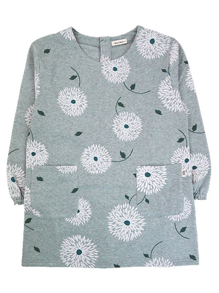 Hand Madeのレディースカッポー、花プリント柄。裏起毛ニット、心地よい裏起毛でぽかぽかあったかい。後ろは全開の4個ボタン留めタイプで背中もあったか。前左右にポケット付き。