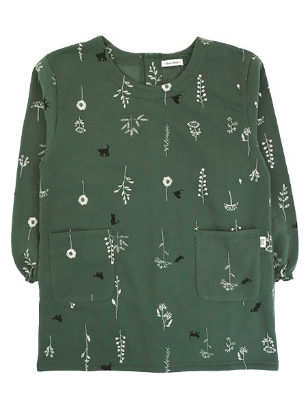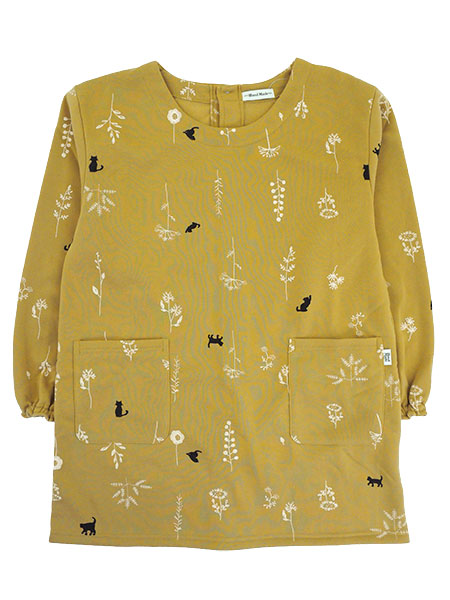 Hand Madeのレディースカッポー、花と猫プリント柄。裏起毛ニット、心地よい裏起毛でぽかぽかあったかい。後ろは全開の4個ボタン留めタイプで背中もあったか。前左右にポケット付き。