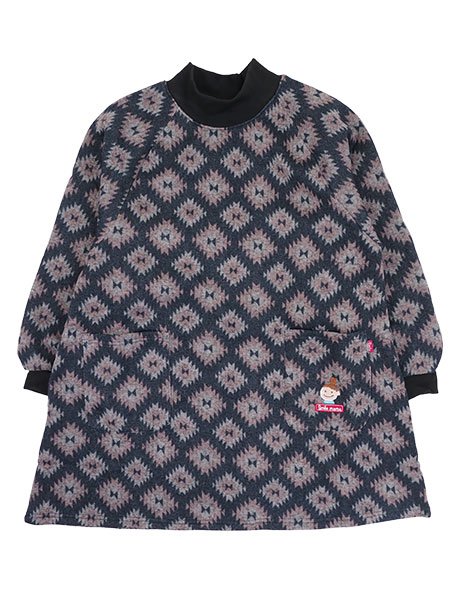 スマイルママのレディースあったか裏起毛カッポー、幾何学柄プリント。やわらかな杢ニット生地のふんわりあったか裏起毛素材。かぶるタイプの割烹着です。前左右にポケット付きで左ポケットにスマイルママのワンポイントがあります。衿周りと袖口はリブ仕様で水仕事をするときに濡れにくく便利で、お仕事らくらく。