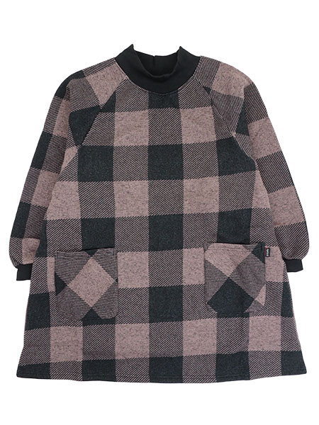 Aprirsiのレディースカッポー。杢ニット生地のふんわりあったか裏起毛素材でかぶるタイプの割烹着です。肩や腕が動かしやすいラグラン袖。ハイネック部分と袖口はリブ仕様で水仕事をするときに濡れにくく便利。チェック柄プリント。前身頃左右にポケット付き。