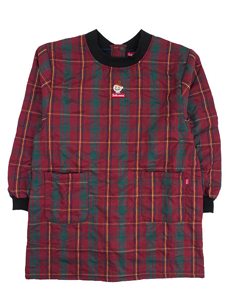スマイルママのレディース裏フリースキルトカッポー背ボタンタイプ。あったか裏フリースの冬用、チェック柄のかっぽう着。胸元中央にスマイルママのワンポイントがあり、衿周りと袖口がリブ仕様になっています。前面両側にポケット付き。4つボタンで後ろ全開タイプのエプロンです。