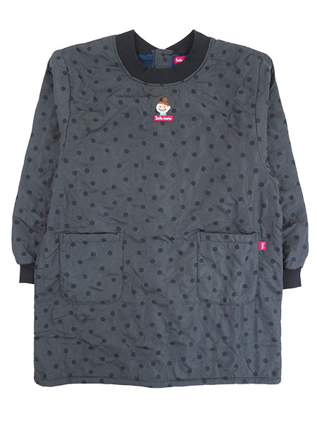 スマイルママのレディース裏フリースキルトカッポー背ボタンタイプ。あったか裏フリースの冬用、水玉柄のかっぽう着。胸元中央にスマイルママのワンポイントがあり、衿周りと袖口がリブ仕様になっています。前面両側にポケット付き。4つボタンで後ろ全開タイプのエプロンです。