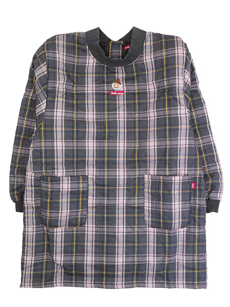 スマイルママのレディース中綿キルトカッポー。中綿入りでふっくら暖かい冬用、チェック柄のかっぽう着。胸元中央にスマイルママのワンポイントがあり、衿周りと袖口がリブ仕様になっています。前面両側にポケット付き。4つボタンで後ろ全開タイプ。裏地はタフタのサラサラしていて着やすいエプロンです。
