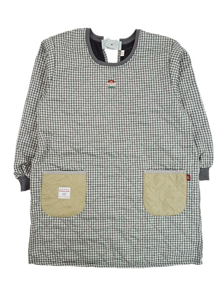 ビッグママのレディースキルトカッポー。フリースの裏地付きで暖かいキルトの冬用かっぽう着。胸元中央にビッグママのかわいいワンポイントがあり、袖口がリブ仕様になっています。後ろはネック部分がワンボタンでウエストはひも調節になります。両サイドにポケット付き。
