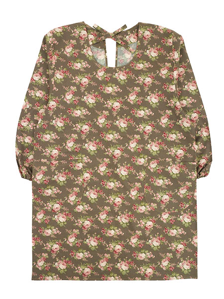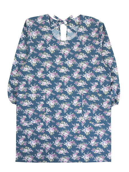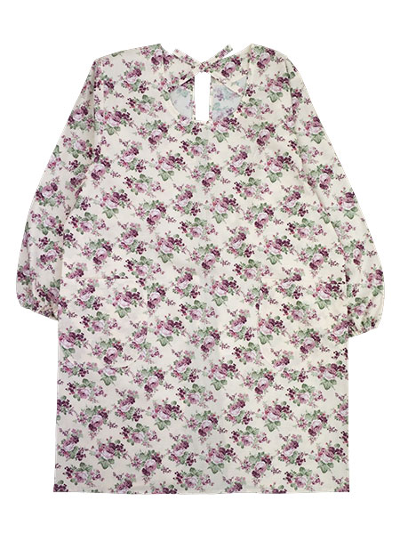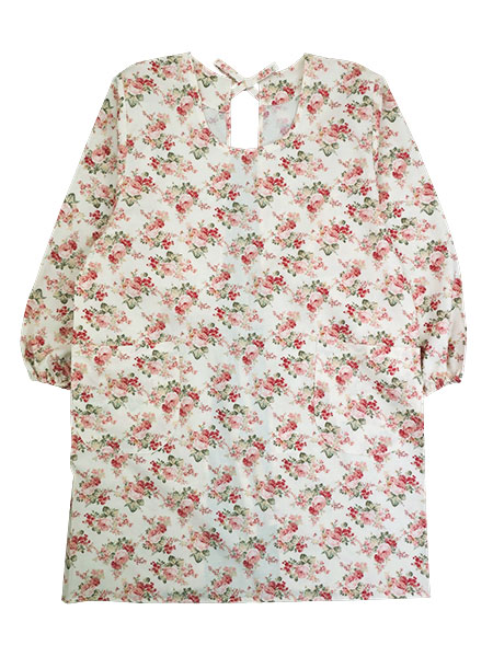 QHOUSEのレディースカッポー。薄手の綿100%生地使用のおしゃれな花柄プリント割烹着です。後ろは全開で、ネック部分、ウエスト部分ともにひも調節となります。生地縫製ともに安心の日本製。年間を通してお使いいただける素材のエプロンです。