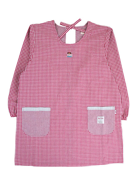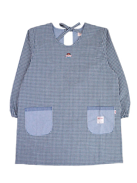 Big mamaのレディースカッポー。胸元にかわいいビッグママのワンポイントが付いたギンガムチェック柄エプロン。別布生地使いがアクセントの左右ポケット付き。後ろは首元、ウエストともにひも調節となります。年間を通してお使いいただける生地のかっぽう着です。