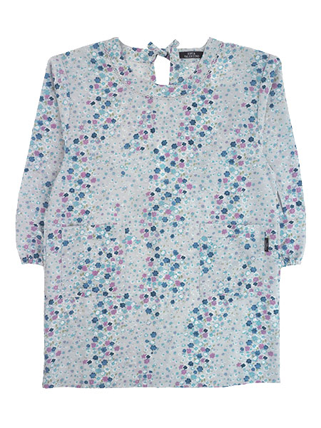 SOFIA VALENTINOのレディースカッポー。サラッとしていて、しわになりにくい薄手ポリエステル素材の割烹着です。おしゃれな小花柄プリント。襟ぐりに同系色のレースの飾り付き。前左右ポケット付き。後ろは首元、ウエストともにひも調節となります。年間を通してお使いいただける生地のかっぽう着です。