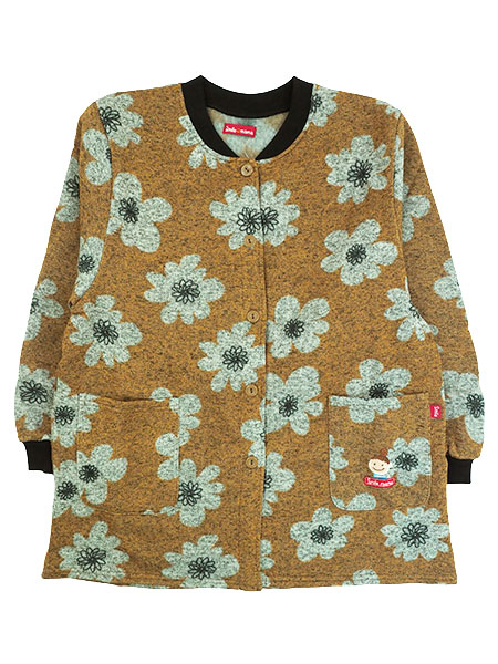 スマイルママのレディース前あきスモック、杢ニット裏起毛、花柄プリント。やわらかなニット生地のふんわりあったか裏起毛素材。5個ボタンの前あきタイプで襟と袖口がリブ仕様になっています。前左右にポケット付き。左ポケットにロゴのワンポイントが付いた暖かい冬向きの前あき割烹着です。