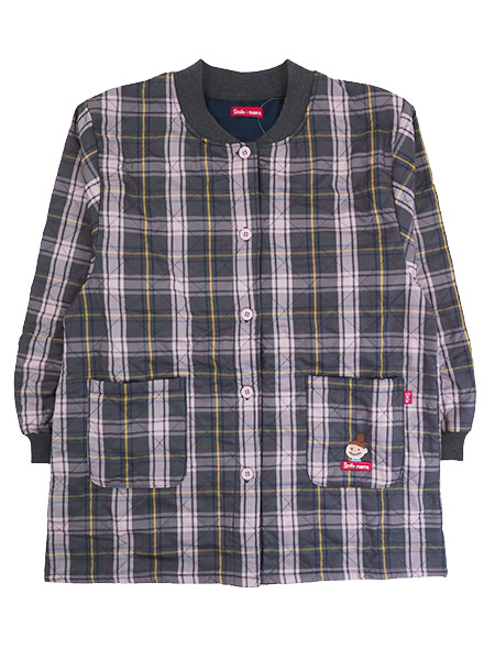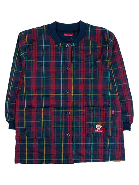 スマイルママのレディース裏フリースキルトスモック。あったか裏フリースの冬用、チェック柄の前あき割烹着。ポケットにスマイルママのワンポイント付き。左右ポケット付き。着やすい5個ボタンの前あきタイプで襟、袖口リブ仕様のスモックエプロンです。