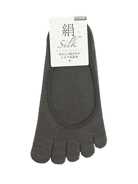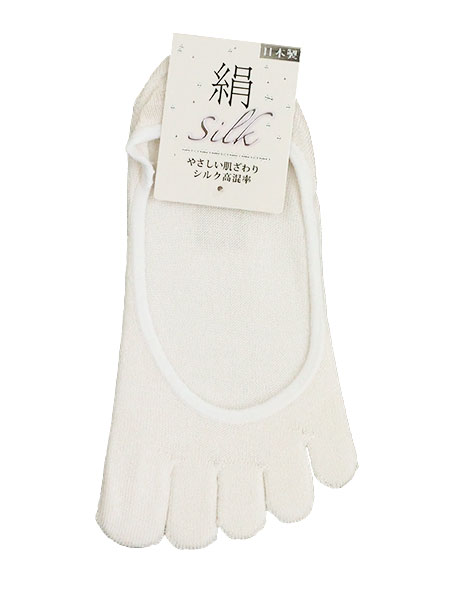絹(silk)のレディース5本指フットカバー。肌にやさしい表糸シルク100%使用。吸湿性、放湿性に優れ、肌をいつも快適に保つことができます。エレガントな光沢としっとりとした風合いのフットカバーです。サイズ:22〜24cm、日本製。
