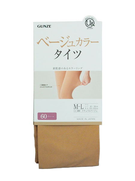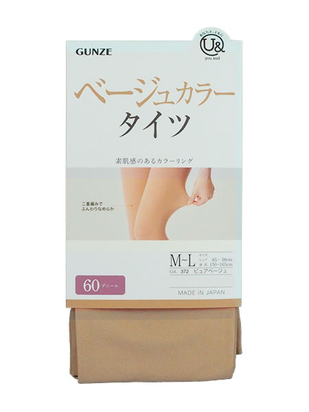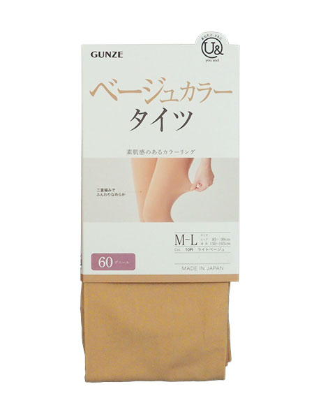グンゼ、you and、レディースベージュカラータイツ、60デニール。二重編みでふんわりなめらか。素肌感のあるカラーリングです。幅広フラットウエストバンドで締め付けすぎずラクな履き心地。サブバンド&幅広ガーターでずれ落ちにくく快適。あたたか二重編み構造でふんわりなめらかな生地感。風を通しにくく暖かい。静電気防止加工、デオドラント加工。