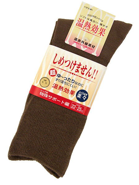 しめつけません!レディースソックス、温熱効果。超ゆ〜ったりなのにずり落ちにくい、レッグ部特殊サポート編でふくらはぎも楽々。遠赤外線素材(特殊セラミック練り込み)で温熱効果もある、冬にうれしいあったかソックス。ソフトな風合い・あたたかさの、ひとにやさしいくつ下です。サイズ:22〜25cm、丈はかかとから約23cm