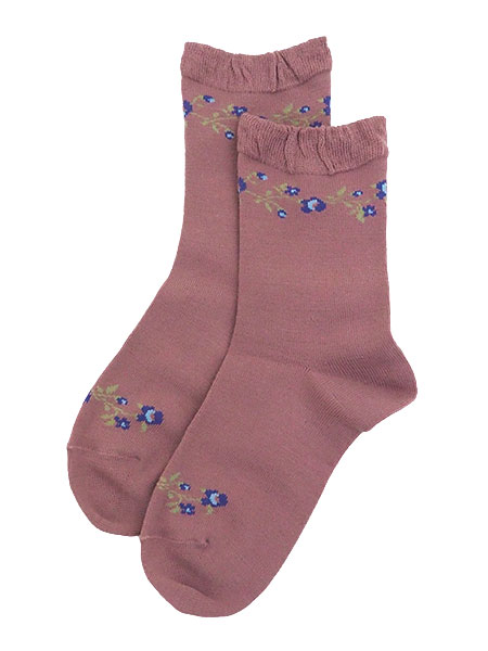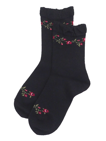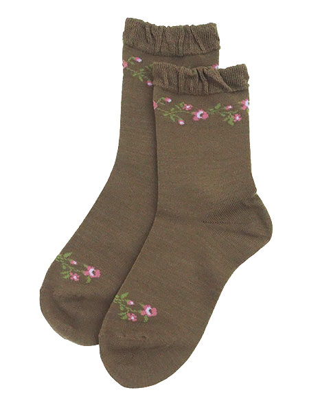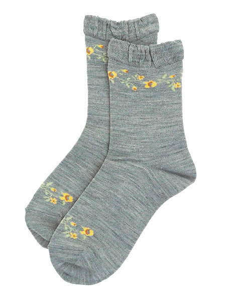 グンゼの肌おもいやり素材、レディースソックス、ソフト毛混。毛混であたたかい秋冬向きの靴下です。履き口がフリル、花柄の可愛らしいデザイン。サイズ:22〜24cm、丈はかかとから約15cm