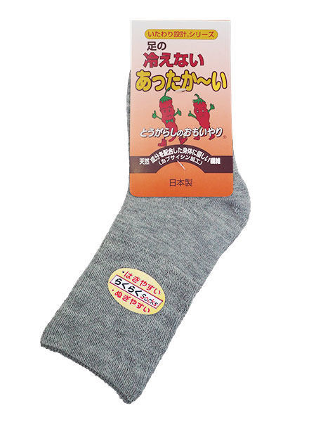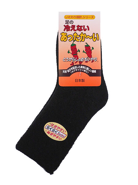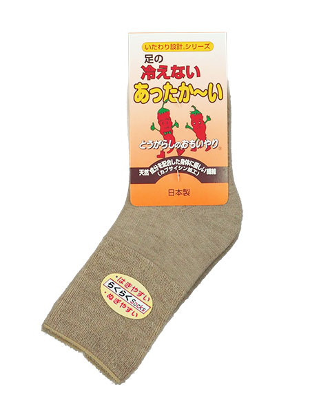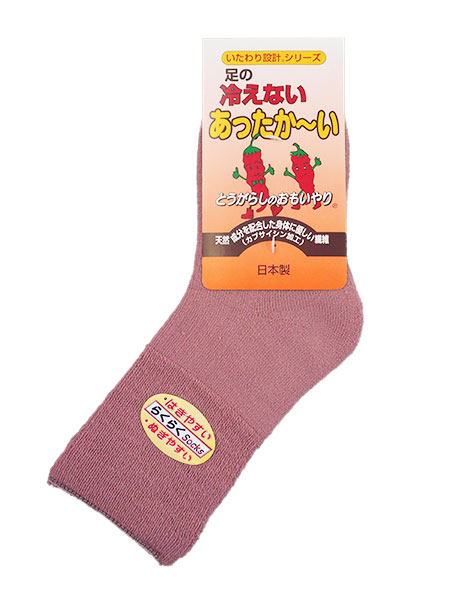 足の冷えないあったか〜いレディースソックス、とうがらしのおもいやり。はきやすくぬぎやすい、らくらくソックス。天然成分を配合した身体に優しい繊維、カプサイシン加工。日本製。サイズ:22〜24cm、丈はかかとから約17cm