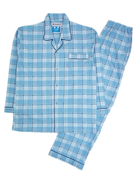 ロワンドのメンズ長袖パジャマ、チェック柄。こだわりの綿100%(コーマ糸を使用)。ソフト感があり、肌ざわりの良いスムース素材を使用した上質なナイティです。安心の日本製です。チェック柄プリント。上衣:テーラー襟の前開き、スナップボタン、左胸にポケット付き。パンツ:前あき、ポケットなし、ウエストゴム取り替え口付き。