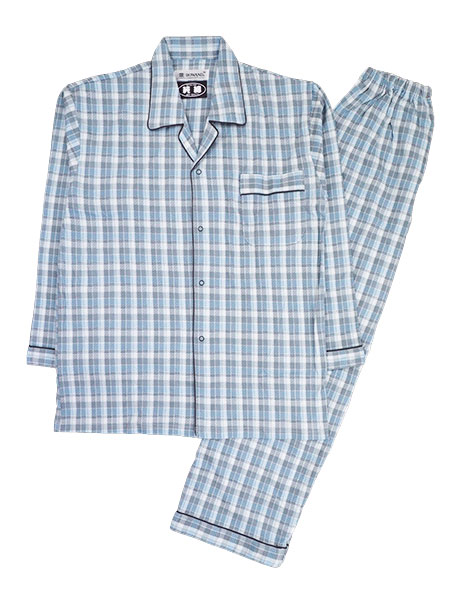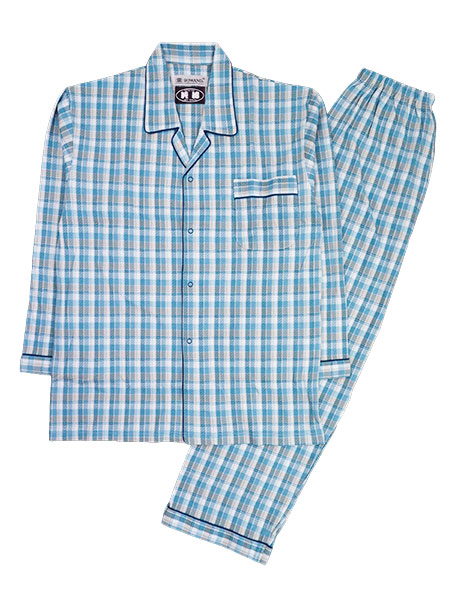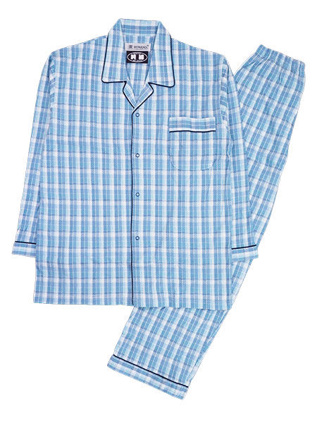 ロワンドのメンズ長袖パジャマ。こだわりの綿100%(コーマ糸を使用)。ソフト感があり、肌ざわりの良いスムース素材を使用した上質なナイティです。安心の日本製です。チェック柄プリント。上衣:テーラー襟の前開き、スナップボタン、左胸にポケット付き。パンツ:前あき、ポケットなし、ウエストゴム取り替え口付き。
