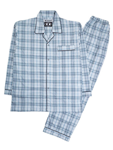 ロワンドのメンズ長袖パジャマ、綿100%天竺素材、チェック柄。日本製、こだわりの純綿素材、さわやかでやさしい肌ざわりの風合いで吸湿性に優れています。上衣のボタンはスナップボタンです。上衣:テーラー襟の前あき、スナップボタン、左胸にポケット付き。パンツ:前あき、ポケットなし、ウエストゴム取り替え口付き。