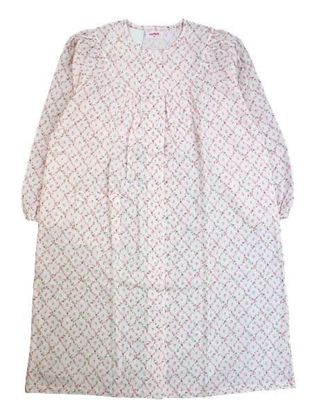 GUNZE(グンゼ)レディース前全開の長袖ネグリジェ、花柄。従来のグンゼ設計のネグリジェより身丈を-10cmにした、身丈短めタイプ。短めの丈をご要望の方におすすめです。お肌にやさしい綿100%。かるくて、やわらかなガーゼ素材です。着脱のしやすい前あきスタイル。袖口ゴム絞りでゴム取り替え口付き。右サイドに便利なポケット付き。