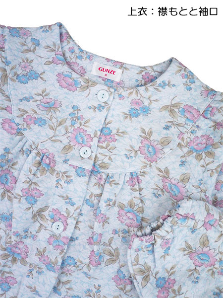 グンゼのレディースパジャマ、グンゼ×京都捺染。京都のこだわり技術でプリントした生地を使用しています。花柄プリントの日本製パジャマです。素材はダイヤキルトを使用しています。寒い季節に適した保温性のある暖かい素材です。 袖・足口ゴム通し穴付き。上衣:襟なし、前あき、袖口ゴム絞り、ポケットなし。パンツ:裾ストレート、ポケットなし、ウエストゴム取り替え口付き。